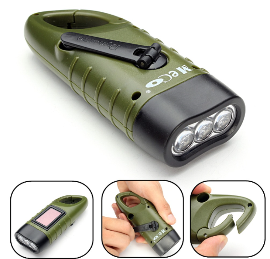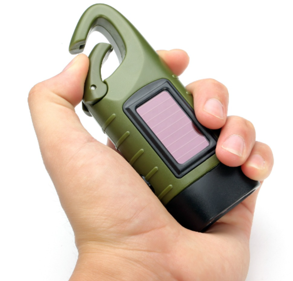 Solar: uma lanterna com carregamento solar e manivela. Com a bateria embutida, você pode economizar energia por um longo tempo sem uma bateria externa. Usando células solares de silício cristalino, o material é um painel de célula solar laminado com vidro temperado.