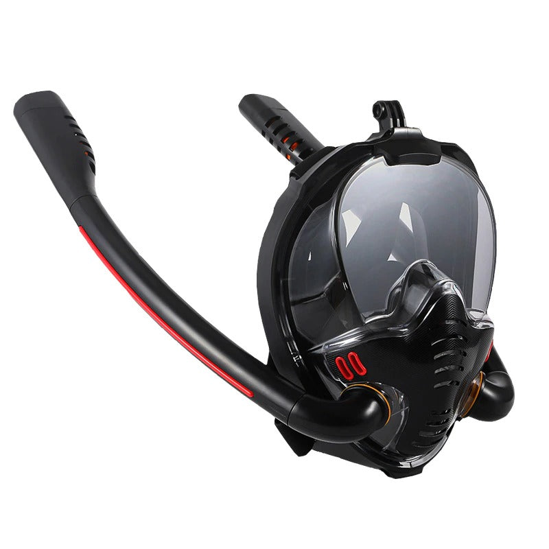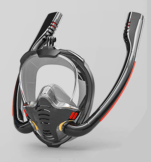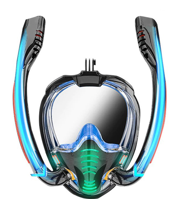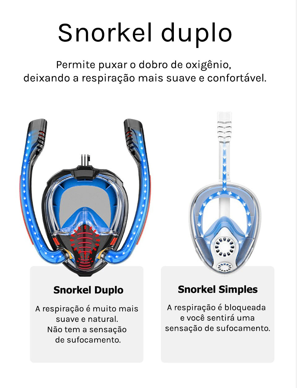 O snorkel duplo permite puxar o dobro da quantidade de oxigênio, deixando a respiração mais segura, suave e confortável. O topo dos snorkels possui um mecanismo de segurança que impede que entre água.